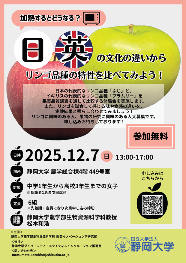 【参加者募集・松本 和浩 教授】研究室公開・実験実施 女子中高生対象 リンゴ50品種に会える 日英の品種を比較してみよう!