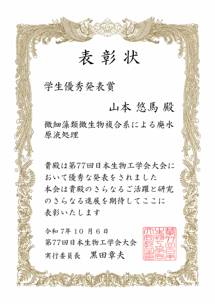 山本悠馬さん(総合科学技術研究科 農学専攻 応用生命科学コース修士1年 応用光合成学研究室(長尾 遼 准教授))が、第77回日本生物工学会で学生優秀発表賞を受賞しました。