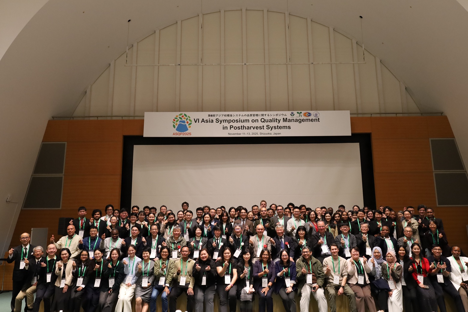 本シンポジウムは、園芸研究分野における世界最大の国際学会である国際園芸学会によって世界各地で開催される、国際的な研究交流を目的としたものです。本年11月11日から13日までの3日間にわたり、静岡市コンベンションアーツセンター「グランシップ」において、世界18カ国から計150名(うち海外からの参加者86名)が参加しました。期間中は、収穫後システムの品質管理をテーマに、2題の基調講演、8題の招待講演を含む12セッションが行われ、計65題の口頭発表と65題のポスター発表を通じて活発な議論が交わされました。また、11月13日には島田市内の「ふじのくに茶の都ミュージアム」や「KADODE OOIGAWA」、さらに静岡市清水区の「鈴木農園」を視察し、特に海外からの参加者から高い評価を得ました。