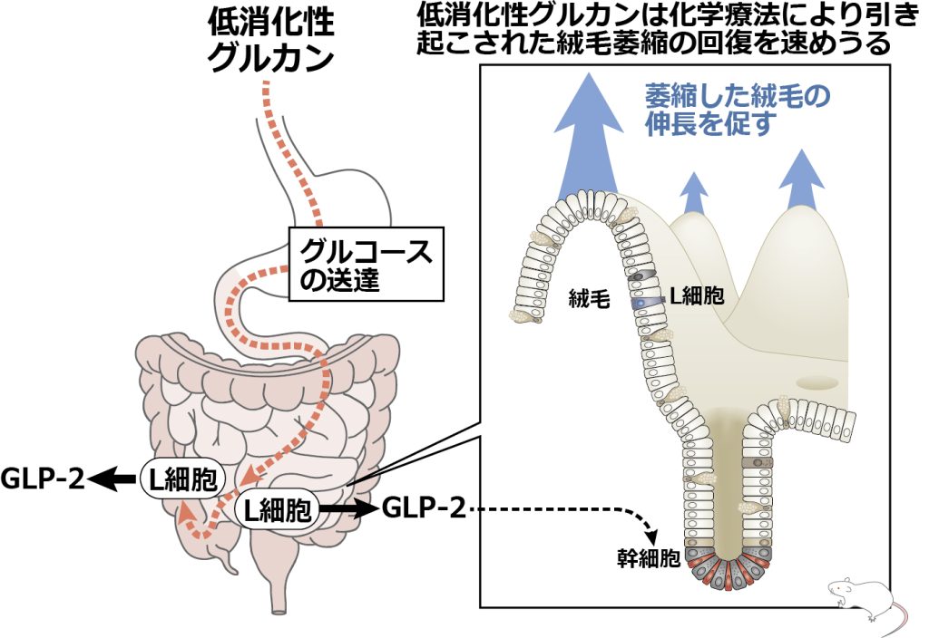 応用生命科学科の西村直道教授と博士課程2年の仁科里佳子さんは、消化されにくいグルカンが腸から分泌されるホルモンであるGLP-2の分泌を高め、その作用を介して抗がん剤により萎縮した小腸絨毛の回復を促進することを、ラットを用いた試験で明らかにしました。本研究は、低消化性の糖質が消化管ホルモン分泌を通じて小腸の構造回復に関与するという新たな仕組みを示すものであり、消化管機能の維持や回復を目的とした食事設計への応用が期待されます(下記のリンクからさらに詳しい解説をお読みいただけます)。